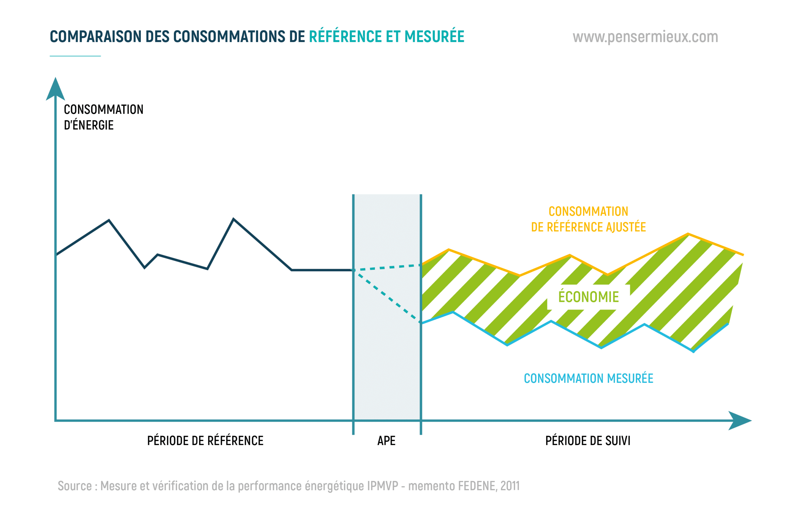 Le CPE se repose sur une valeur relative, qui est une comparaison basée sur une période de référence, et une période de suivi. Ainsi, l’historique détaillé des consommations datées de la période de référence va servir de base à cette comparaison. On prendra également en compte les évolutions (climat, température moyenne du bâtiment, horaires d’ouverture, surfaces modifiées, etc.), pour établir une estimation de la consommation de référence. La différence entre cette consommation estimée et la consommation réelle mesurée représente l’économie d’énergie.
